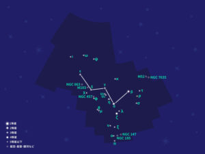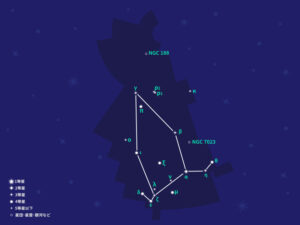 はくちょう座からカシオペヤ座にかけて流れる天の川の中に、ジグザグの小さなW字型のように形づくる星座だが、目立った明るい星がないため、全体の形状を想像するのは少し分かりにくいかもしれない。