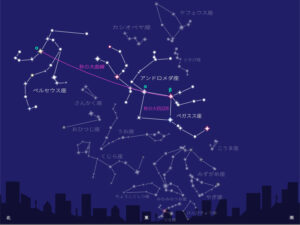 北半球の秋の南東の夜空で見られる、秋の大四辺形*ペガススの大四辺形から始まり、ペガスス座β星「シェアト」とアンドロメダ座α星「アルフェラッツ」、さらにカシオペヤ座の明るい星を結んだ大きな曲線を指し、秋の星座や星を見つける目印となっている。