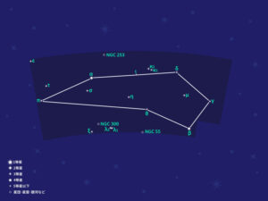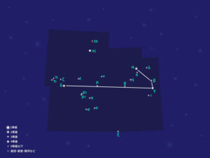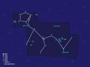 「秋の大四辺形*ペガススの大四辺形」の南東あたりのアンドロメダ座とくじら座の間に、「く」の字を押しつぶしたように形づくる星座だが、4等星以下の目立った明るい星がないため、全体の形状を想像するのは少し分かりにくいかもしれない。
