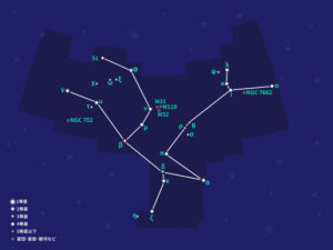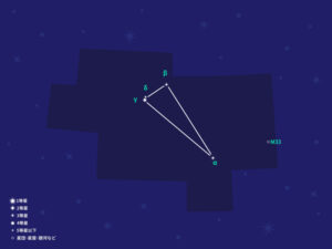 アンドロメダの頭にあたる位置で青白く輝いてみえるα星「アルフェラッツ」を頂点に、アルファベットの「A」のような形を北東の方向へ形づくる。