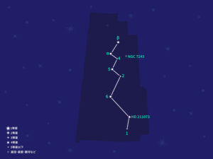 「秋の大四辺形*ペガススの大四辺形」のすぐ南にあり、三ツ矢サイダーの「ロゴマーク」に似た4つの星を結んでできる「三ツ矢」と呼ばれる星の並びが特徴的な星座で、みなみのうお座α星「フォーマルハウト」という明るい星の北側に大きく広がっているが、明るい星がないので全体の形状を想像するのは少し分かりにくいかもしれない。