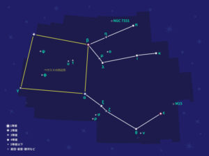 北半球にある日本では、秋の南の中天の空に見ることができる星座。